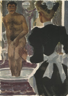 P. Eryx 1950. Petit in-4° en ff, sous chemise et étui. 500 €Frontispice et 20 compositions de SAINTE-CROIX mises en couleurs à la main dans les ateliers de P. Crampe et J. Monnier sous la direction du peintre. Tirage limité à 685 exemplaires, un des 195 sur vélin de Rénage avec une suite en noir, une suite H.C. de 8 dessins avec remarques, une suite de 6 dessins refusés avec remarques. Notre exemplaire est enrichi d'une aquarelle et d'un patron (non prévu à la justification).